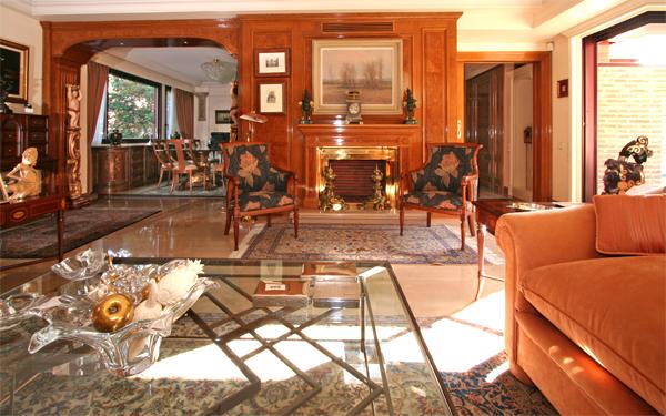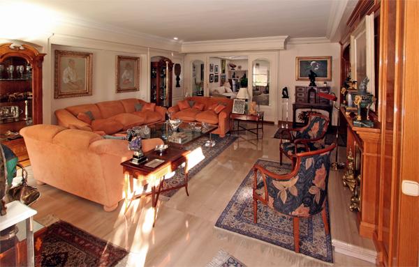 En la fotografía superior, una vista en profundidad del salón principal. Las dos grandes puertas cristaleras y correderas, al fondo de la imagen, son de tipo decorativo, existiendo -detrás de ellas- las normales correspondientes a la carpintería exterior de la vivienda. | |