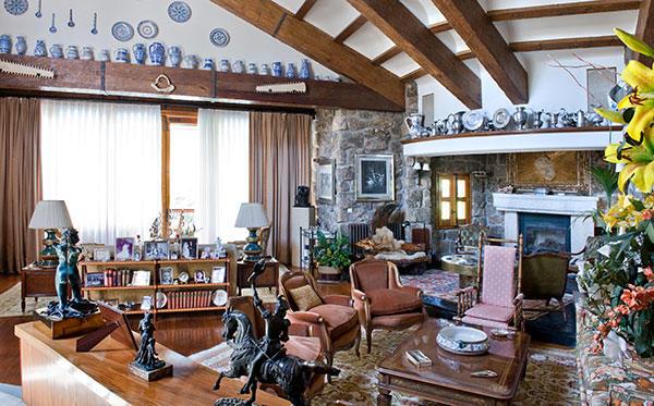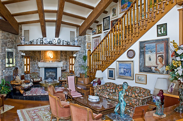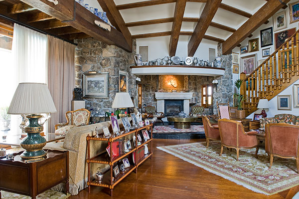 Desde el hall entramos en el espacioso salón organizado en varios ambientes y con techo a doble altura. Llama la atención las grandes vigas de madera del techo y la bonita pared de piedra del fondo. |