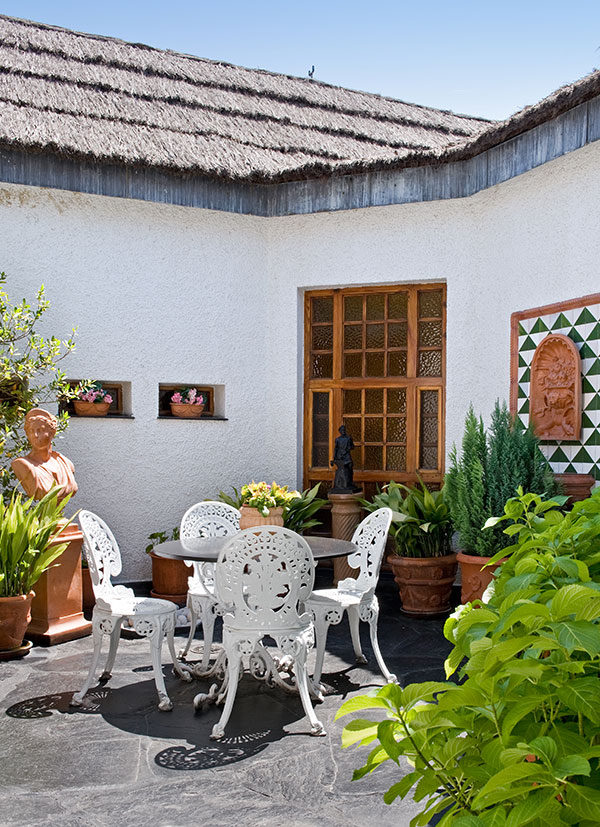 Vista del patio de luz alrededor del cual gira toda la casa y al que se puede acceder desde el salón o el comedor. El suelo es de pizarra negra, como el de la entrada de la casa. |