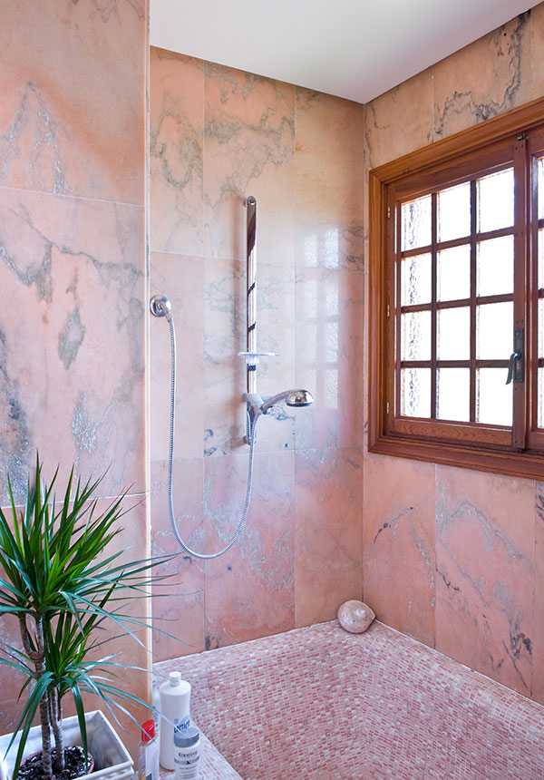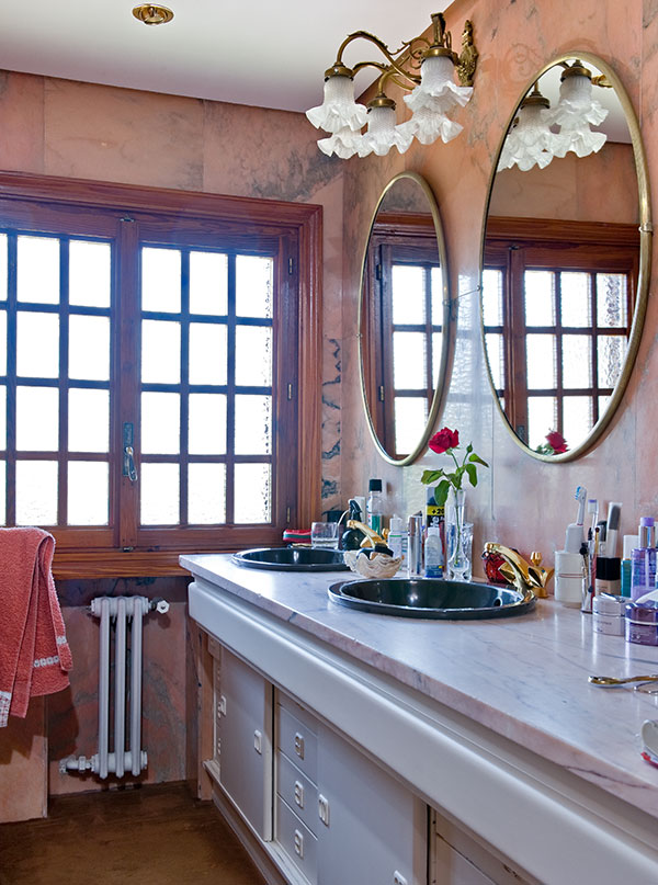 Otro detalle del baño principal con su original bañera por debajo del nivel del suelo, y las paredes recuebiertas de mámol italiano. |