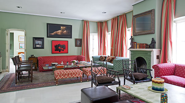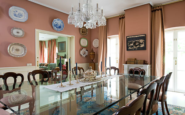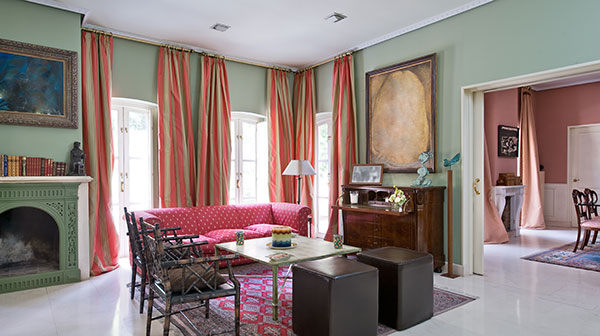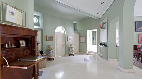 Otro ambiente del salón. A la derecha se aprecia el comedor, al que se accede mediante una doble puerta corredera. El suelo es de mármol de color claro. |