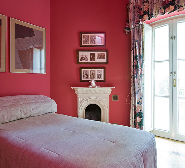 Detalle de otro dormitorio más, con una original y elegante chimenea con embocadura de piedra tallada. |