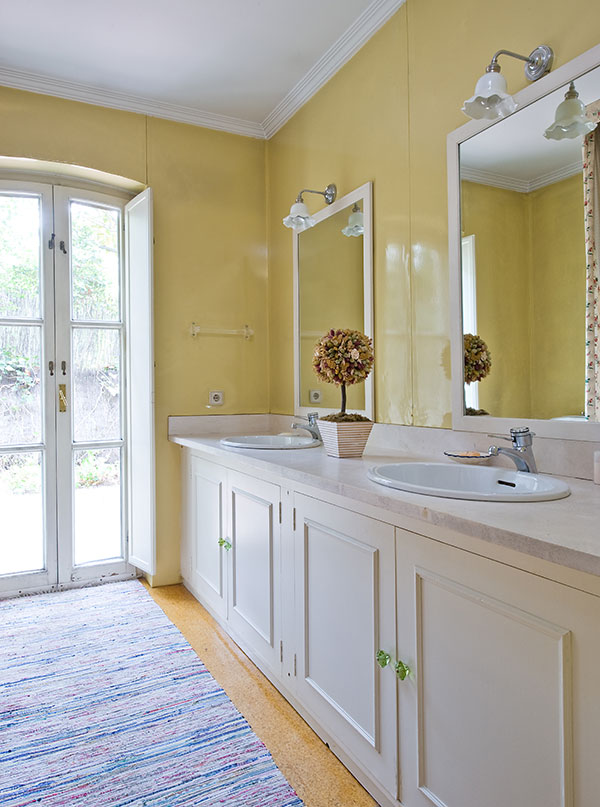 Vista del amplio y luminoso baño que comparten ambos dormitorios. Gracias a la original estructura de la casa, todas las estancias tienen salida al jardín, por lo que la sensación de estar rodeado de jardín por todas partes es muy relajante. |