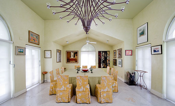 Salimos al jardín y entramos en el pabellón que alberga un amplio comedor de verano, rodeado de arboles y césped. La piscina está ubicada en un costado del mismo. |
