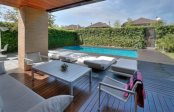 Vista parcial del porche solado, al igual que las zonas que rodean a la piscina, en madera de teka. La zona de solarium en grandes piezas de piedra sin pulir.