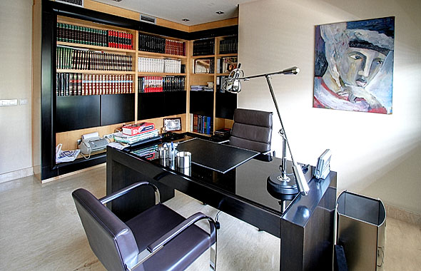 Un amplio despacho en forma de "L" nos deja observar la calidad de las paredes con una cuidadísima preparación "en liso" que ha permitido la aplicación de pinturas decorativas de gran calidad.