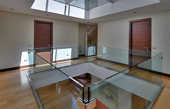 El distribuidor de la primera planta, cuadrangular y abierto sobre la planta baja, recibe luz directa del lucernario situado en la cubierta gracias a la gran zona del suelo de la planta abuhardillada realizada en cristal templado, como luego podremos contemplar.