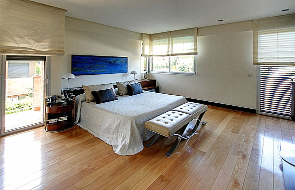 El amplísimo dormitorio de la suite principal dispone de espacio adicional para estar y lectura, desde el que está tomada la fotografía. Grandes ventanales en dos de sus paños y salida a una agradable terraza con vistas al jardín y a la piscina.
