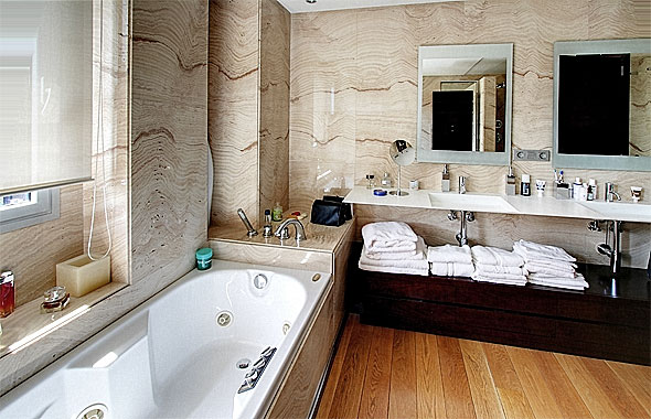 Encimera con doble lavabo de muy moderno diseño, bañera de hidromasaje, cabina independiente de ducha y sanitarios en ambiente semiseparado. Todas las paredes recubiertas en mármol de veta remarcada en tonos más fuertes.