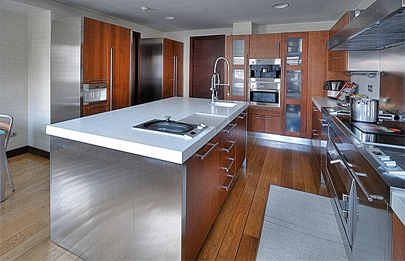 A la cocina y oficio no le falta detalle. Isla central con pileta y freidora, columna de horno microondas y cafetera, horno de gran capacidad y gran placa vitrocerámica, frigoríficos panelados y un largo etcétera. |