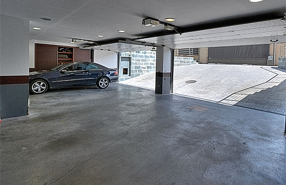 Dos grandes portones mecanizados de doble anchura -con control por radiofrecuencia- proveen de un cómodo acceso a las cuatro plazas de un garaje cuya amplitud permite disponer de espacio adicional para motos y bicicletas. |
