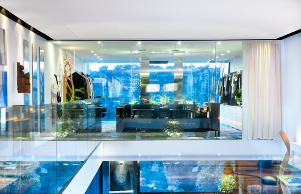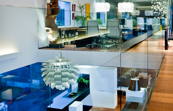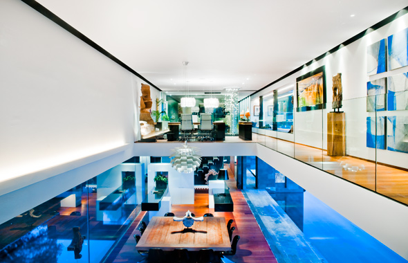 Vista desde el pasillo de la primera planta. Apreciamos en primer plano parte del salón -en la planta baja- y el despacho abierto de la primera planta. Todo el perímetro del pasillo tiene una barandilla de cristal. |