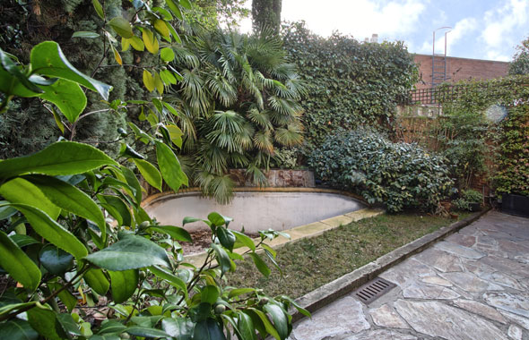 Sobre estas líneas una vista del jardín que rodean parcialmente al chalet, uno de sus grandes atractivos. Diseñado por el prestigioso paisajista Pedro Alajarín incluye entre su consolidada vegetación tres esplendidos cipreses, laureles, palmeras, un granado y numerosos macizos de perennes entre las que han buscado su hueco unas soberbios camelios.