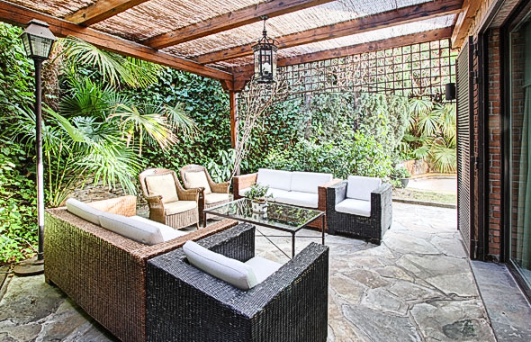 En la imagen una vista de la agradable pérgola que encontramos en el jardín, a la salida de la zona de recibo.