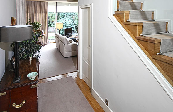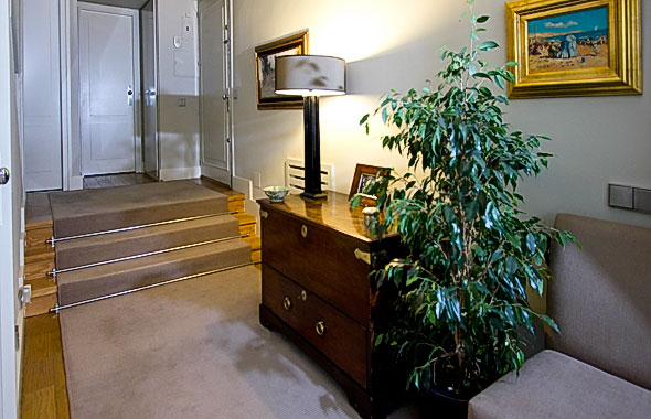 Una nueva perspectiva del hall, tomada esta vez desde el ángulo opuesto. La puerta que vemos cerrada al fondo corresponde al aseo de cortesía y a la derecha la de acceso a la vivienda.