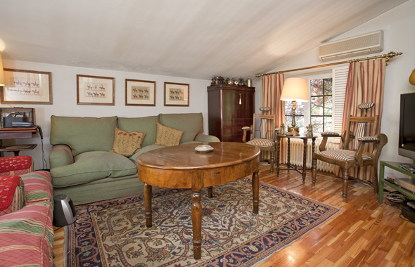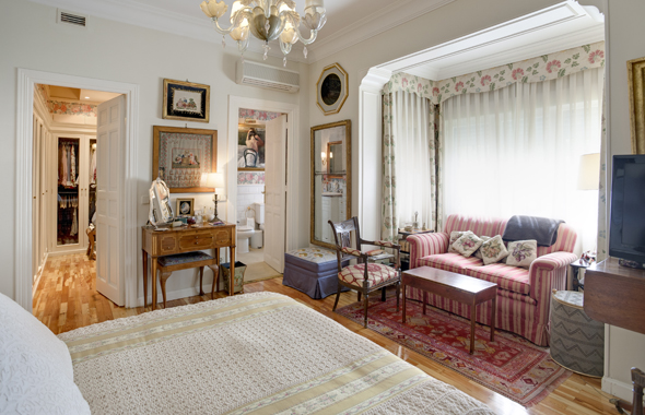 | Esta imagen, tomada desde el distribuidor de la suite principal, muestra las preciosas puertas de madera maciza lacadas en blanco, el suelo de lama estrecha de pino y la escalera que conduce al segundo piso. |