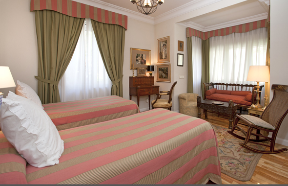 Vista de un dormitorio en suite de invitados con una preciosa galería de obra que inunda de luz la habitación. El perfecto acabado de las paredes permite la aplicación de pinturas decorativas de calidad. Y en el techo, escayolas de sencilla presencia, acentúan la elegancia del chalet |