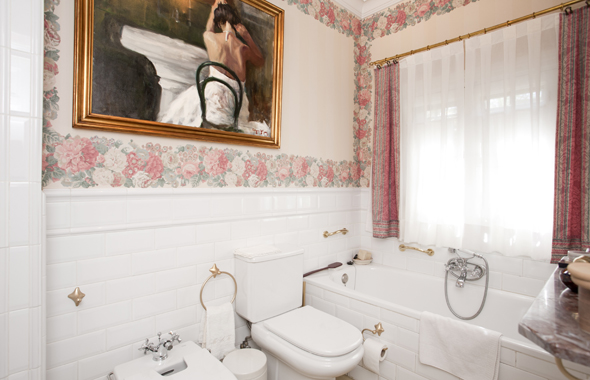 El baño de la suite principal goza de una gran ventana sobre la bañera, también cuenta con ducha y doble lavabo. Es una combinación perfecta de funcionalidad al estilo clásico |
