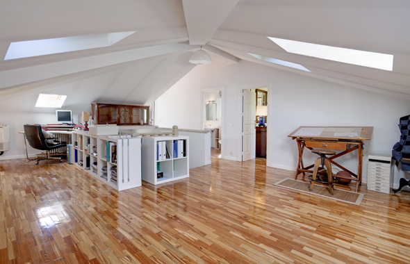 estudio abuhardillado dotado de grandes claraboyas que permiten el