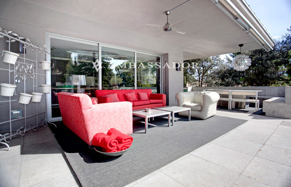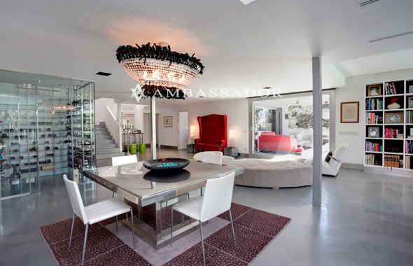 Tanto desde el salón como desde la cocina se accede a los porches, piscina y jacuzzi exterior. En la imagen mostramos parte de la zona de estar que comunica con la cocina, y en segundo plano, identificamos el comedor de verano que continua en "L" rodeando la fachada. |