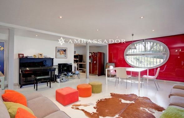 La planta baja de la vivienda cuenta con este fantástico salón multiusos con cocina completa, gran baño y salida al jardín. En esta planta encontramos también el dormitorio de servicio con baño en suite, y los cuartos de calderas y depuradora. |