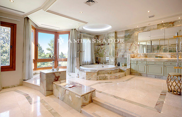 El espectacular baño revestido en mármol en suelos, encimeras y paredes cuenta con un bonito jacuzzi al pie de un ventanal. También dispone de un gran frente de armarios empotrados con puertas de espejo en el paño no visto de la imagen, pero cuyo reflejo intuimos en el gran espejo que preside la zona de lavabos. |