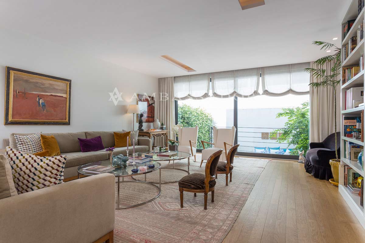En la planta baja además del hall de entrada nos encontramos con el salón. Un espacio con grandes ventanales, desde los que tenemos la posibilidad de apreciar el patio, el cual inunda de luz natural todo el interior del chalet. Destacar la discreta y sutil iluminación del techo. |