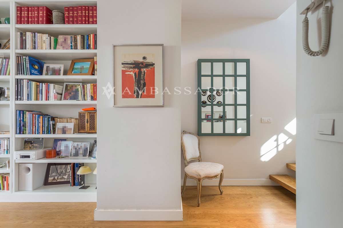 Sobre esta líneas tenemos el hall de entrada de este chalet pareado de 320m2 construidos. Podemos apreciar las excelentes calidades de la vivienda. Suelos de madera de roble, paredes y techos con pintura lisa y una carpintería de madera lacada en blanco de alta calidad. |