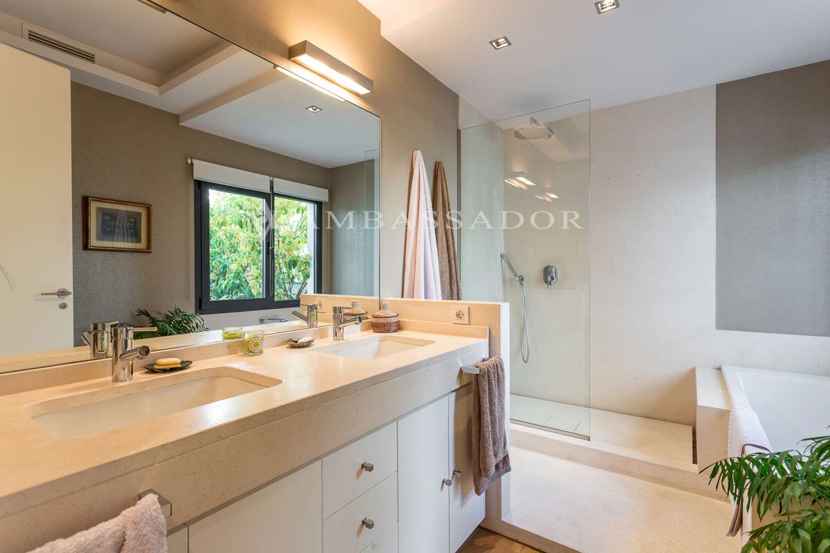 | El cuarto de baño principal está revestido en material porcelánico y tiene una encimera de mármol con 2 lavabos encastrados y un mueble de almacenaje realizado en madera lacada en blanco con puertas y cajones, además de un plato de ducha con zona de secado, una bañera, bidé e inodoro. |