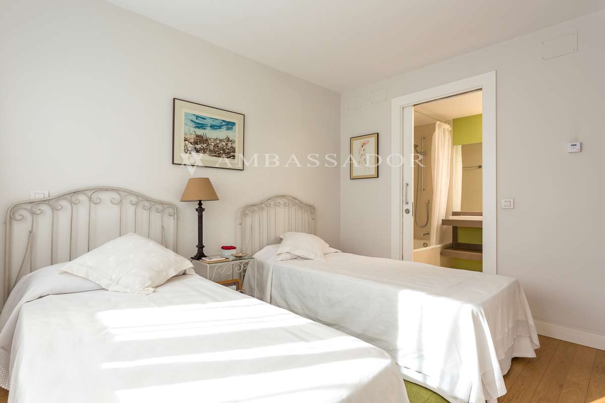 En la primera planta además del dormitorio principal, también hay otros dos dormitorios con su cuarto de baño. Sobre estas líneas podemos ver uno de ellos. Son espacios amplios y luminosos, con espacio suficiente para poder crear en él diferentes ambientes. |