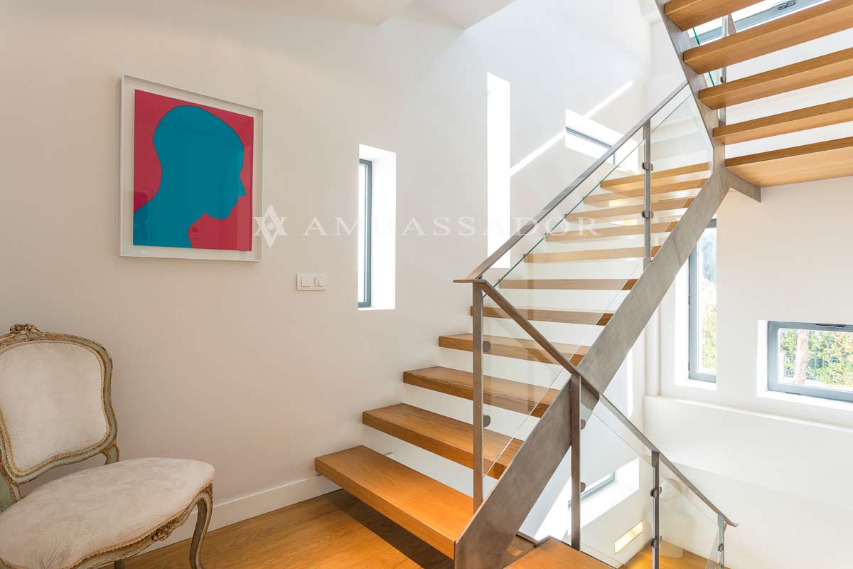 Las escaleras que comunican las diferentes plantas de la edificación son abiertas y con un peto de vidrio. Estas dos características son importantes para que la luz de este pareado llegue hasta el último rincón. |
