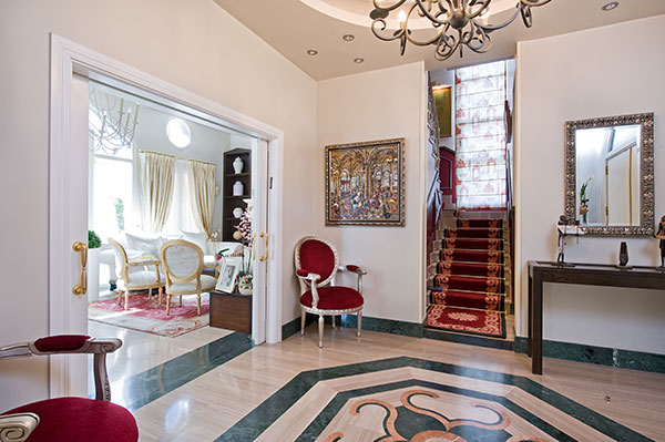 Vista del amplio hall de entrada. Destacan varios elementos; por una parte la bonita puerta doble corredera de acceso al salón, y por otra, el elegante dibujo geométrico del suelo realizado con tres tipos distintos de mármol. |