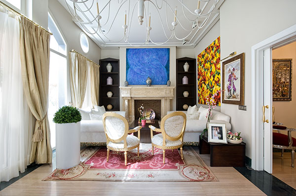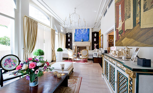 Detalle de una zona del salón, presidida por una bonita chimenea con embocadura de mármol travertino tallado. |