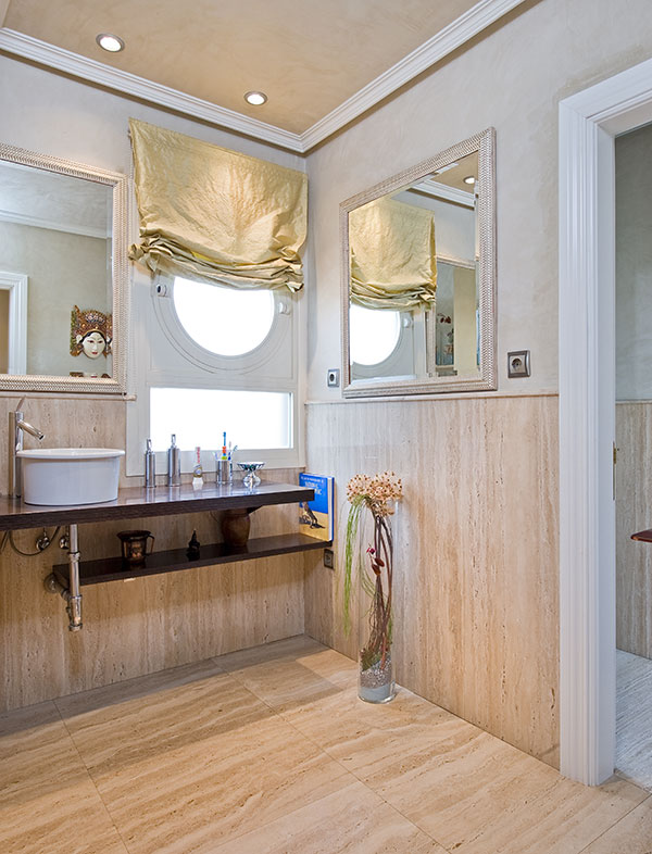 Detalle del elegante baño de cortesía, muy amplio y de exquisito diseño. Destaca el bonito mármol travertino del suelo y paredes. |