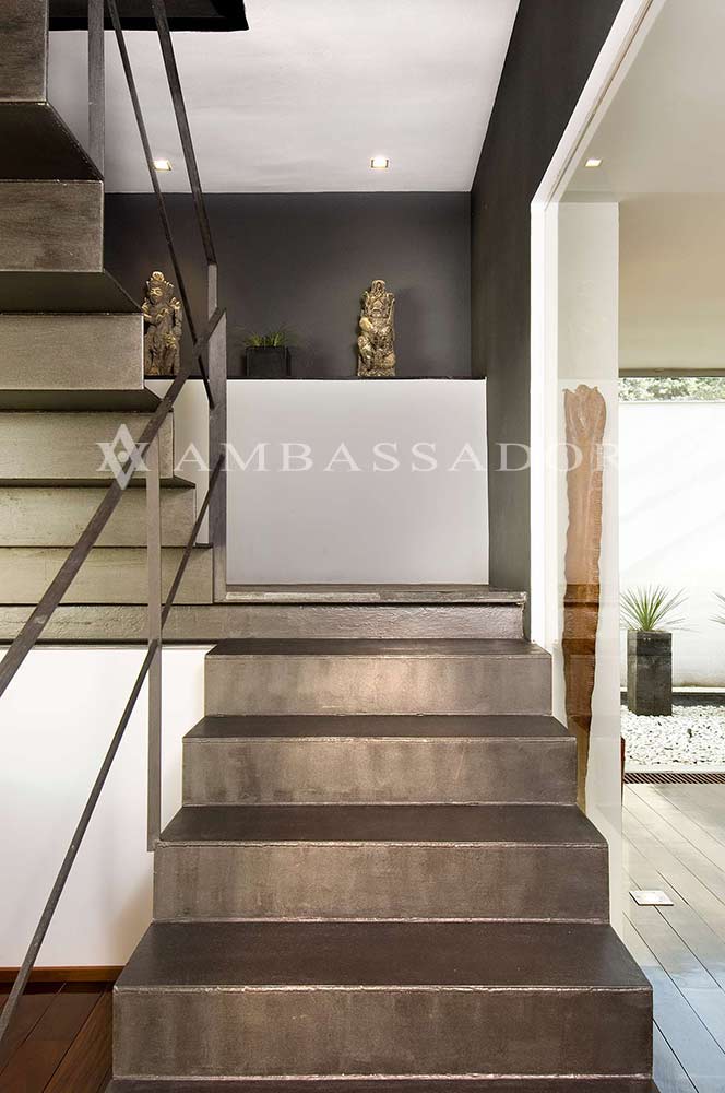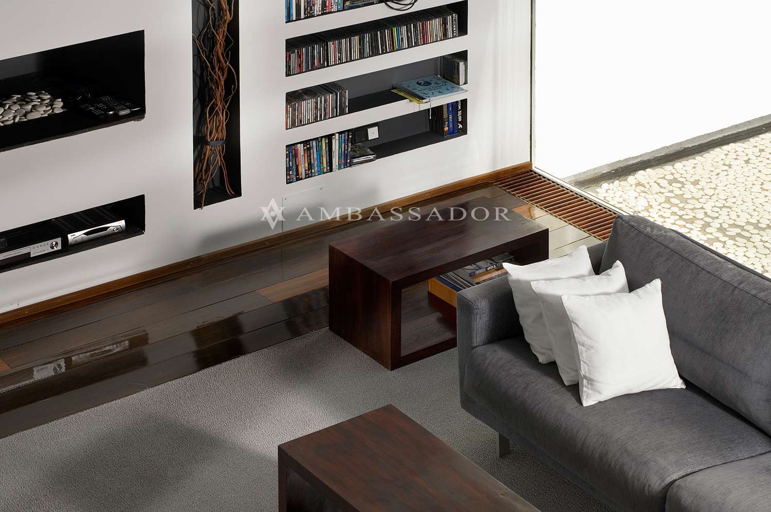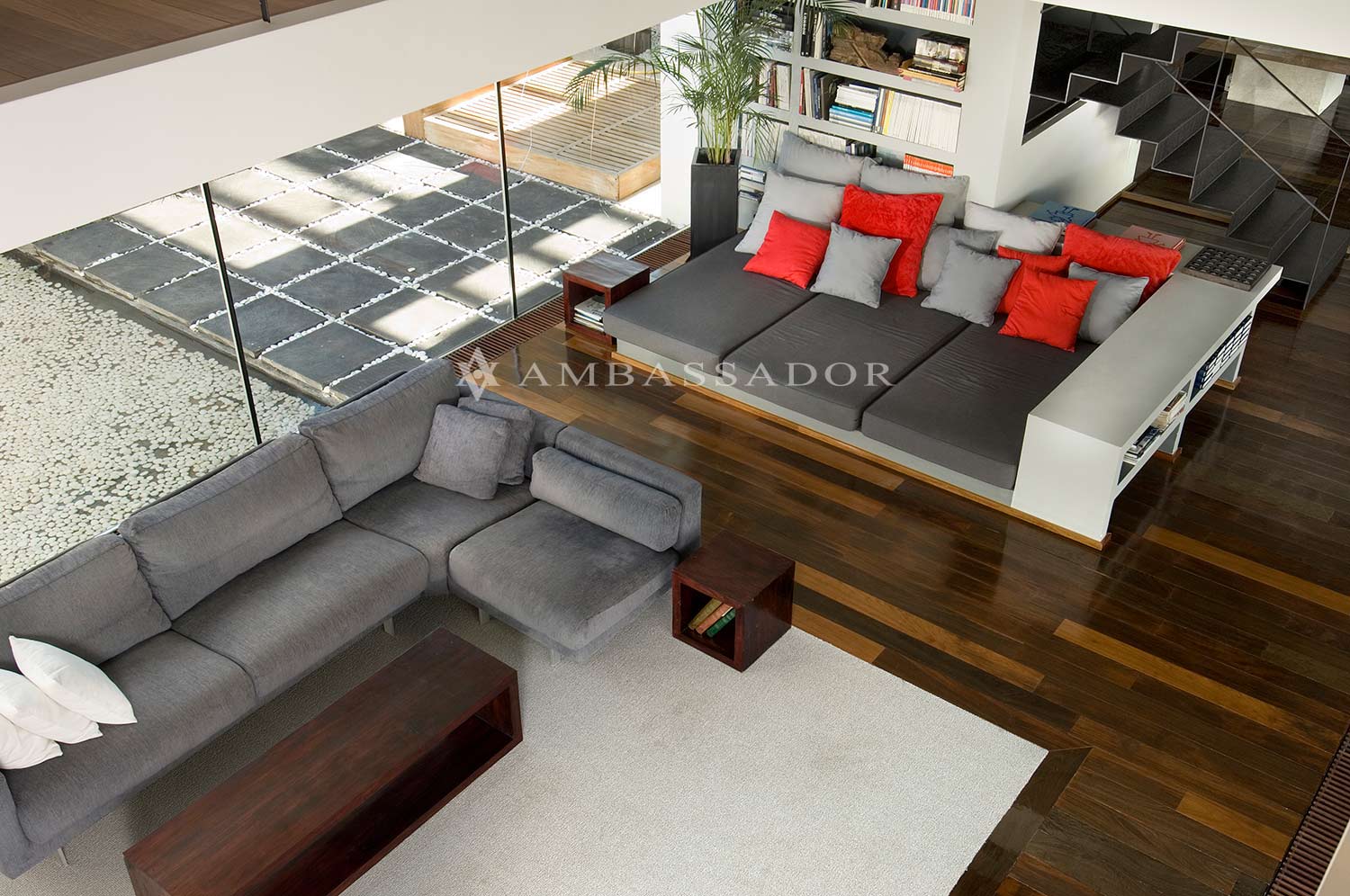 A la casa se accede mediante una pasarela elevada con balaustrada de redondos entrecruzados y estanques comunicados. El hall de entrada da paso a una galería de arte perimetral colgada sobre el salón principal situado en la planta inferior. Las puertas exteriores e interiores son de teka maciza. |