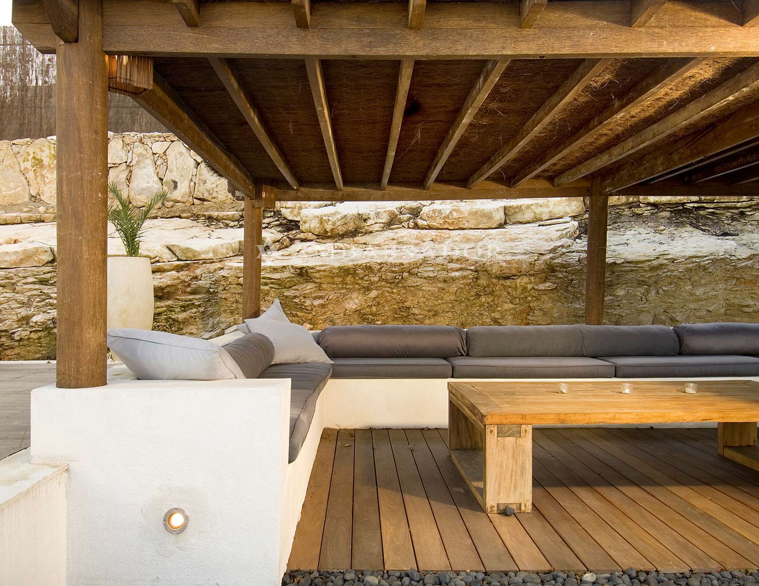 En la planta baja encontramos el salón principal, con chimenea y ambiente chill out de relax o para disfrutar del cine proyectado sobre el paramento superior de la chimenea. Los suelos son de madera de ipe. |