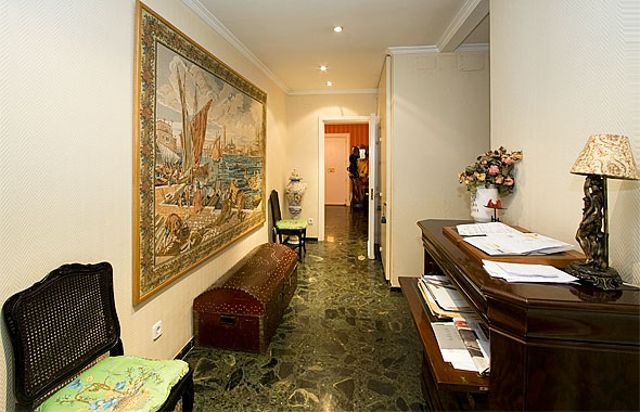El distribuidor general de la vivienda comienza con una zona de gran anchura -prácticamente una habitación mas- en donde ha encontrado su sitio una cómoda escritorio que "recibe" la correspondencia y las notas de última hora. |