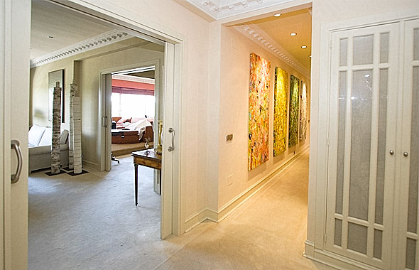 En la fotografía sobre estas líneas una imagen que nos permite darnos idea de la distribución de la vivienda. Está tomada desde el hall y en ella podemos ver el armario gabanero -a la derecha-, la puerta corredera que nos da paso a la zona de recibo, con doble puerta corredera también entre el salón principal y el comedor-estar, y a la derecha el distribuidor longitudinal que nos irá dando acceso a la zona de servicio y a la zona familiar. |
