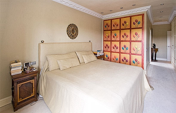 Otra perspectiva del dormitorio de la suite principal. Podemos apreciar la zona de vestidor iluminada por la luz natural que le llega desde el cuarto de baño, que al igual que los otros de la zona de familia dispone de ventanas de tipo velux en sus techos, accionadas por un sistema de apertura y cierre eléctrico. |