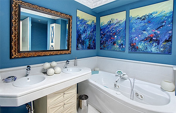 Vista parcial del cuarto de baño de la suite principal. Encimera de corian, bañera de hidromasaje, cabina independiente de ducha y sanitarios en ambiente semiseparado. |