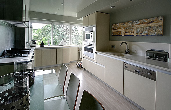 A la entrada de la cocina una zona de desayunos. Los suelos en tarima de laminado, encimeras en corian, fuegos a gas y barbacoa de carbón vegetal. |