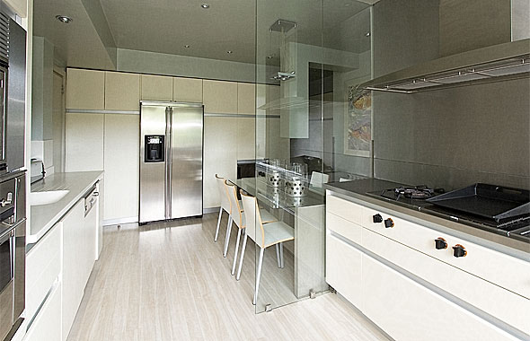 La zona de desayunos se protege parcialmente por una mampara de cristal templado. Al fondo un frigorífico de doble cuerpo enmarcado por armarios vajilleros "techo-suelo" de gran capacidad. |
