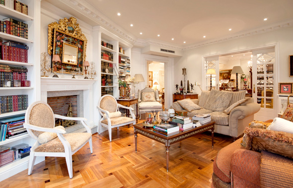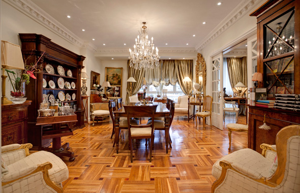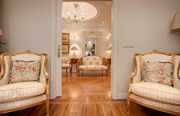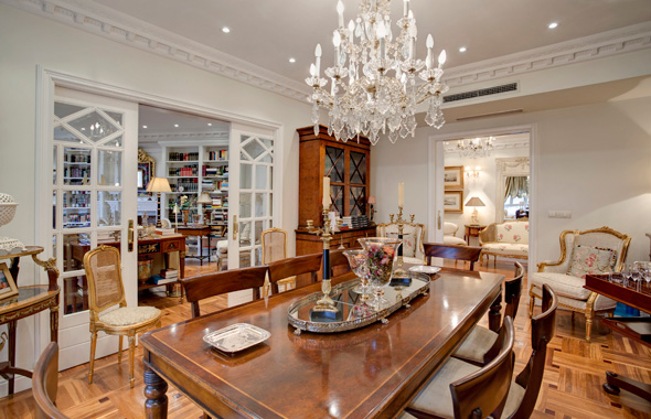 La zona de estar del salón se encuentra presidida por una fantástica chimenea de estilo neoclásico con boisseries que recorren toda la pared. A través de una puerta corredera doble con palillería en blanco, se accede al comedor independiente. |