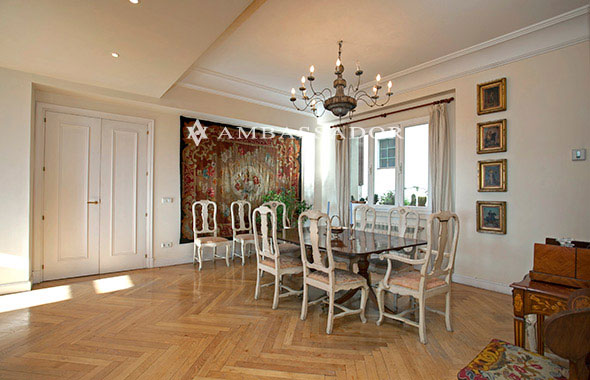 El luminoso comedor está decorado con juegos de escayola que le confieren una mayor profundidad. El excelente acabado en liso de las paredes se encuentra en perfecto estado y permite la aplicación directa de pinturas de calidad. |
