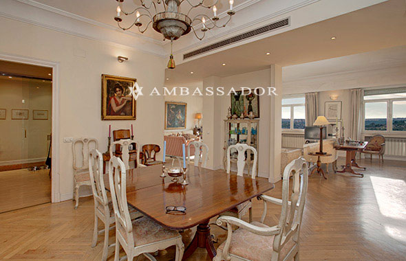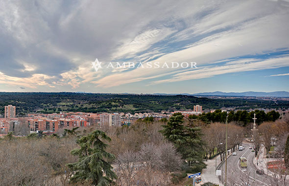 Desde los 5 ventanales de la zona de recibo que recorren el despacho y los salones podemos apreciar 180º de vistas sobre el Oeste de Madrid, incluyendo la Sierra de Madrid, La Casa de Campo o la plaza de Luis Camoes. |