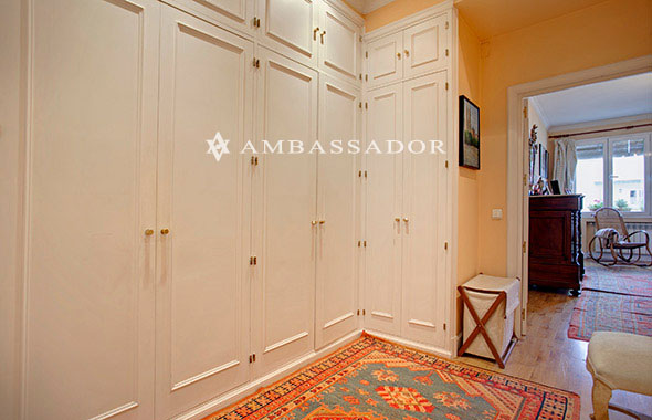 El vesidor esta cubierto por altos armarios empotrados con maleteros. Sus puertas en blanco roto muestran un diseño sencillo y elegante. El vestidor comunica con el dormitorio y con el baño a través de grandes vanos abiertos. |