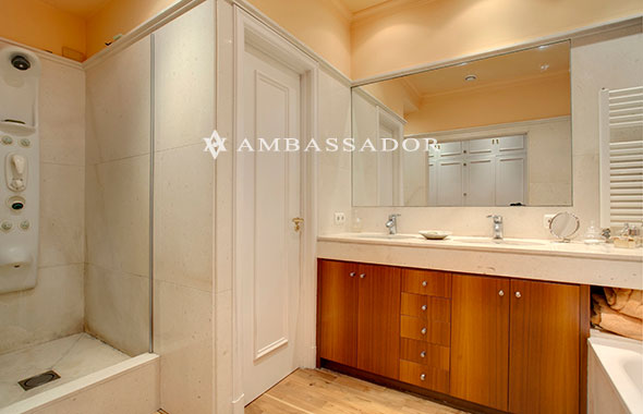 El gran baño cuenta con doble cabina de ducha con columna de hidromasaje, bañera y encimera con doble seno. Predominan los colores cálidos y la piedra natural presente en paredes y encimeras. |