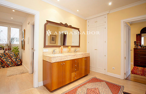 Aquí encontramos la encimera en mármol con dos lavabos que da servicio a los dos dormitorios. Apreciamos también parte del amplio pasillo en "L" de la vivienda, iluminado por una bonita ventana. |