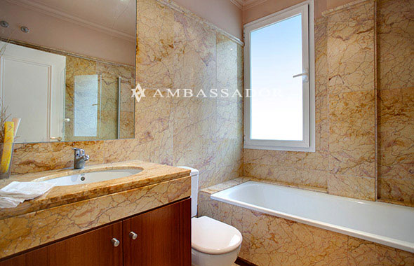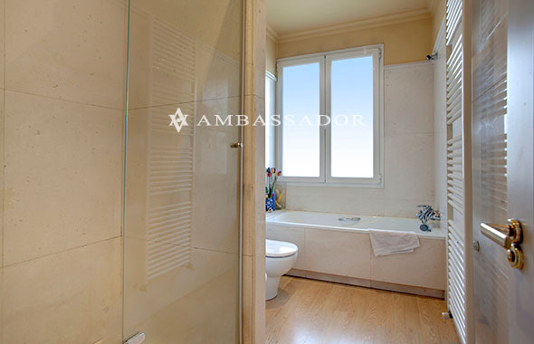 El baño del dormitorio de invitados está revestido en mármol y cuenta igualmente con abundante luz natural. La vivienda dispone también de entrada de servicio que apbre a la zona de lavandería. |