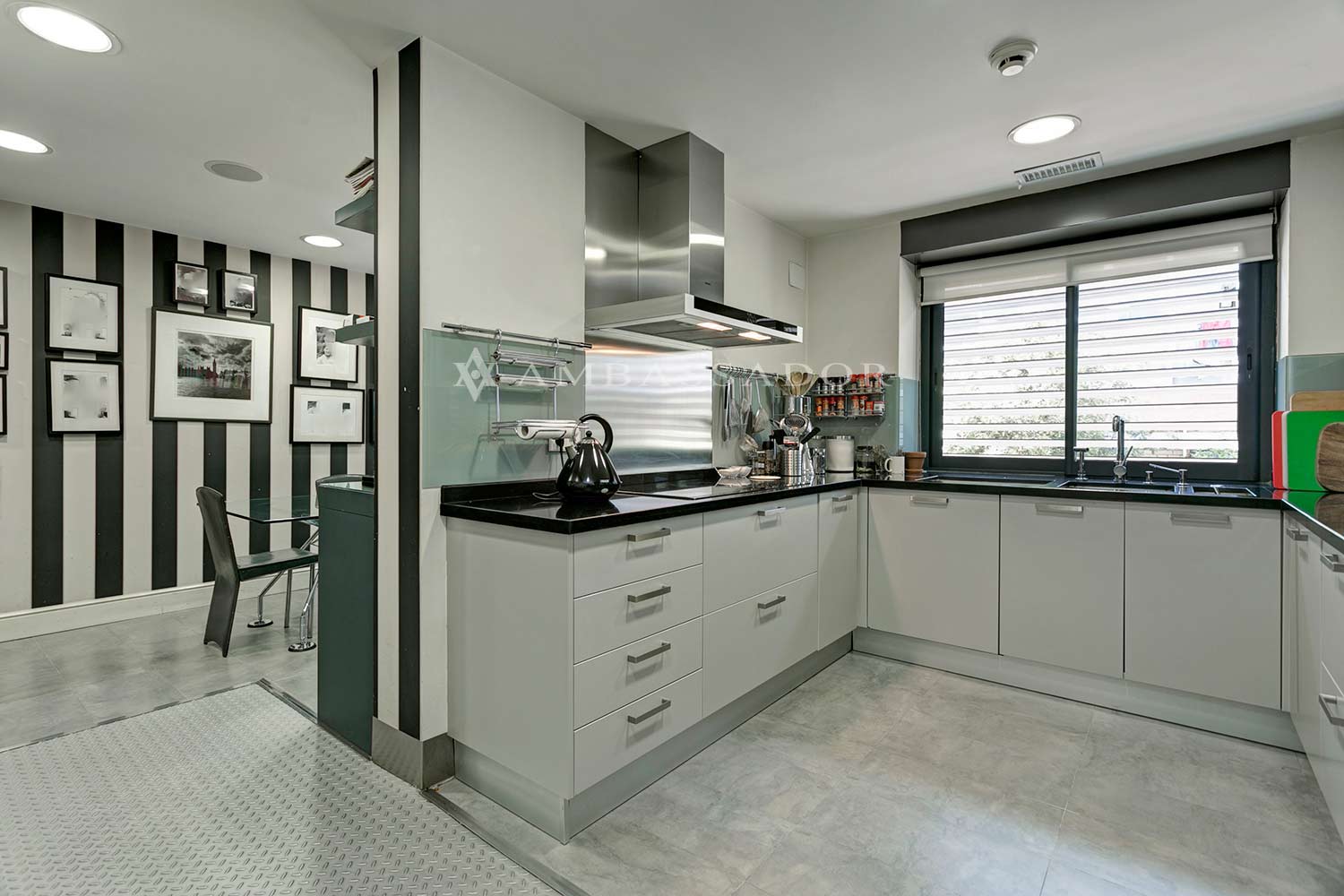 La cocina está totalmente equipada con electrodomésticos de última generación, encimeras en piedra y paredes lisas que alternan con papel pintado en raya regencia. |